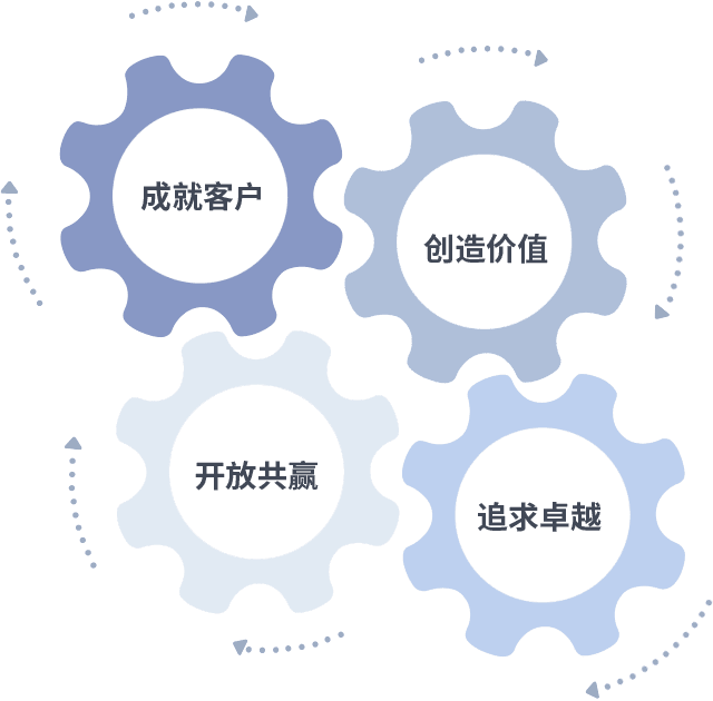 成就客户是一切决策的出发点,,创造价值是衡量所有工作的标准,,,,追求卓越是我们做事做人的态度,,,开放共赢是我们的格局也是最终的结果。。价值观的齿轮环环相扣,,,,推动着组织里的每个人不断向前。。。。