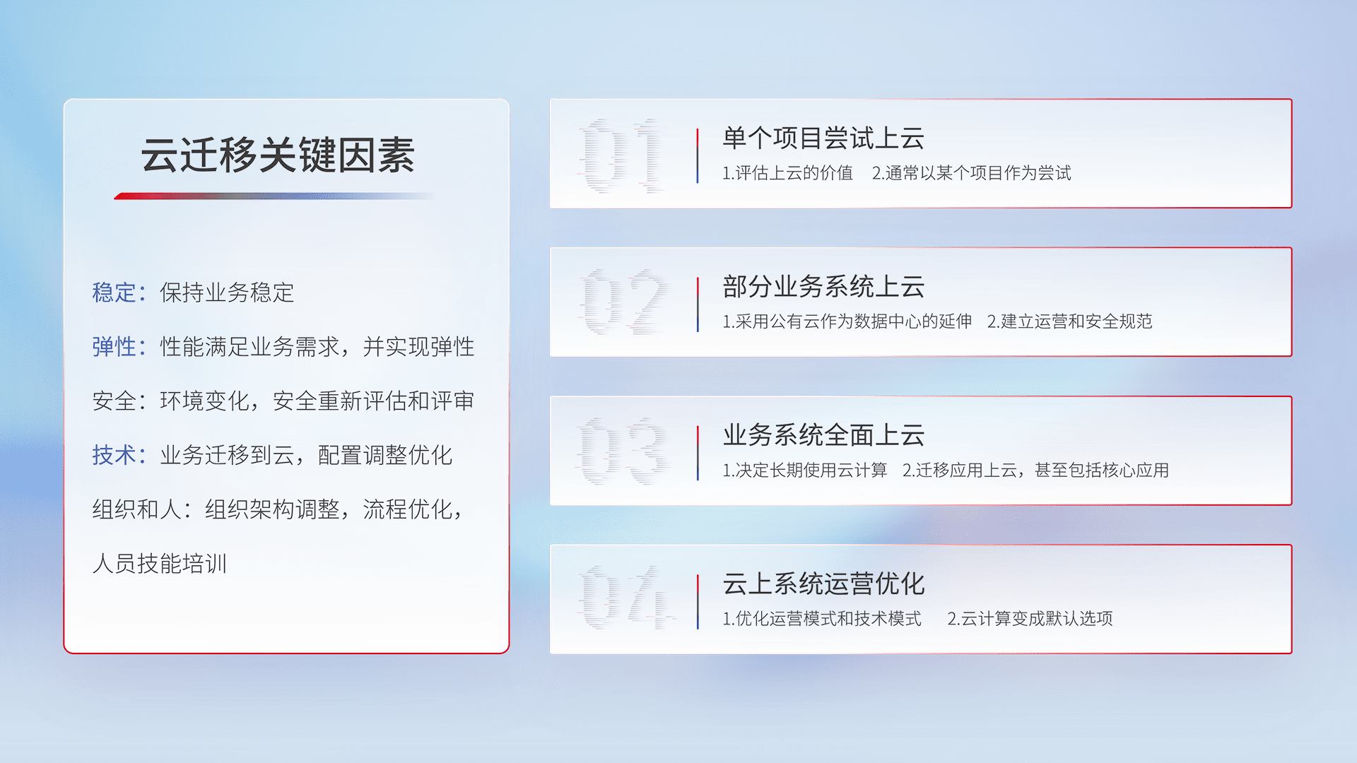 结合实际业务,,,,从规划设计、、云平台选型、、、、云原生改造、、、数据迁移、、、、集成交付,,迁移全过程为客户识别最佳上云路径,,,做好风险识别管理,,设计网络架构、、、身份权限、、安全审计合规、、、、操作审计、、、日志审计、、、监控告警策略、、、多站点容灾设计等,,对云上基础设施进行整体规划,,,提升IT治理水平,,以满足弹性、、、高可用、、高性能的需求。。。。