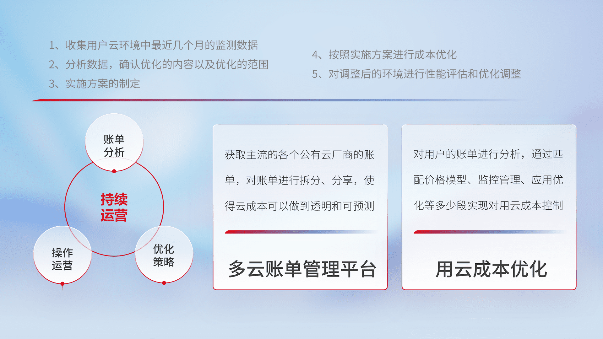 通过多云纳管,,以统一的资源数据模型把客户的云资源进行抽象和封装,,进而实现对多云资源的统一操作,,,,保障云资源管理的可靠性、、稳定性与可用性。。。量身定制化运维内容,,配置、、开发运维、、补丁管理、、、备份、、监控、、认证和访问管理、、审计和日常巡检等,,,保障在用云过程中的可靠度,,,稳定度以及高可用率。。。